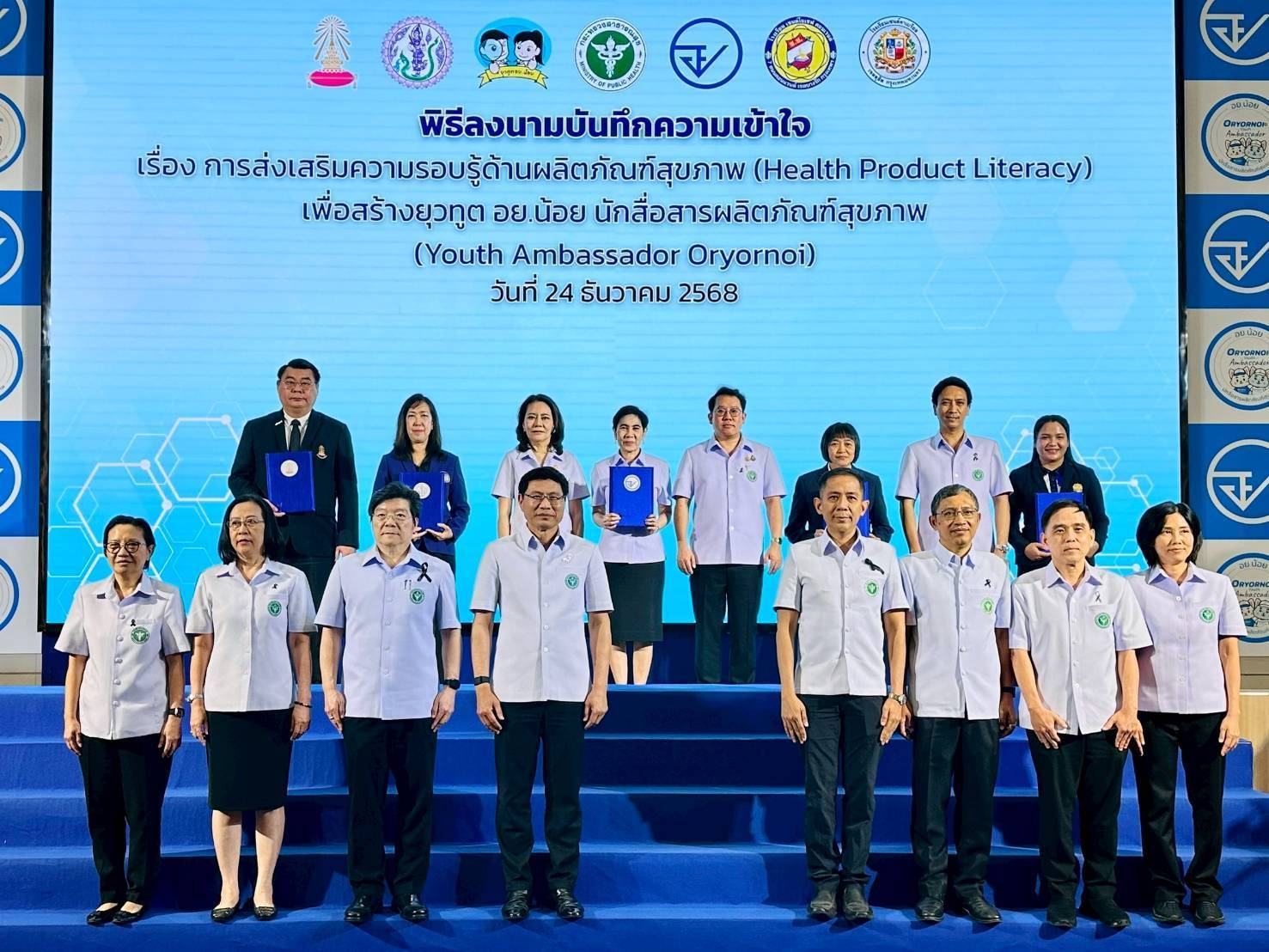 วันนี้ (24 ธันวาคม 2568) ที่ห้องประชุมชั้น 10 อาคาร OSSC สำนักงานคณะกรรมการอาหารและยา (อย.) นายพัฒนา พร้อมพัฒน์ รัฐมนตรีว่าการกระทรวงสาธารณสุข เป็นประธานแถลงข่าวเปิดตัวกิจกรรม ยุวทูต อย.น้อย (Youth Ambassador Oryornoi) พร้อมเป็นพยานพิธีลงนามบันทึกข้อตกลงความร่วมมือ (MOU) เรื่อง การส่งเสริมความรอบรู้ด้านผลิตภัณฑ์สุขภาพ (Health Product Literacy) เพื่อสร้างยุวทูต อย.น้อย นักสื่อสารผลิตภัณฑ์สุขภาพ ระหว่าง อย. กับสถานศึกษา 4 แห่ง ได้แก่ โรงเรียนเตรียมอุดมศึกษา, โรงเรียนสาธิตแห่งมหาวิทยาลัยเกษตรศาสตร์, โรงเรียนเซนต์โยเซฟคอนเวนต์ และ โรงเรียนเซนต์คาเบรียล รวมถึงมอบใบประกาศนียบัตรโรงเรียนนำร่องยุวทูต อย.น้อย ในเขตกรุงเทพมหานคร ให้ทั้ง 4 โรงเรียน และสมาคมผู้ปกครองและครูโรงเรียนเตรียมอุดมศึกษา