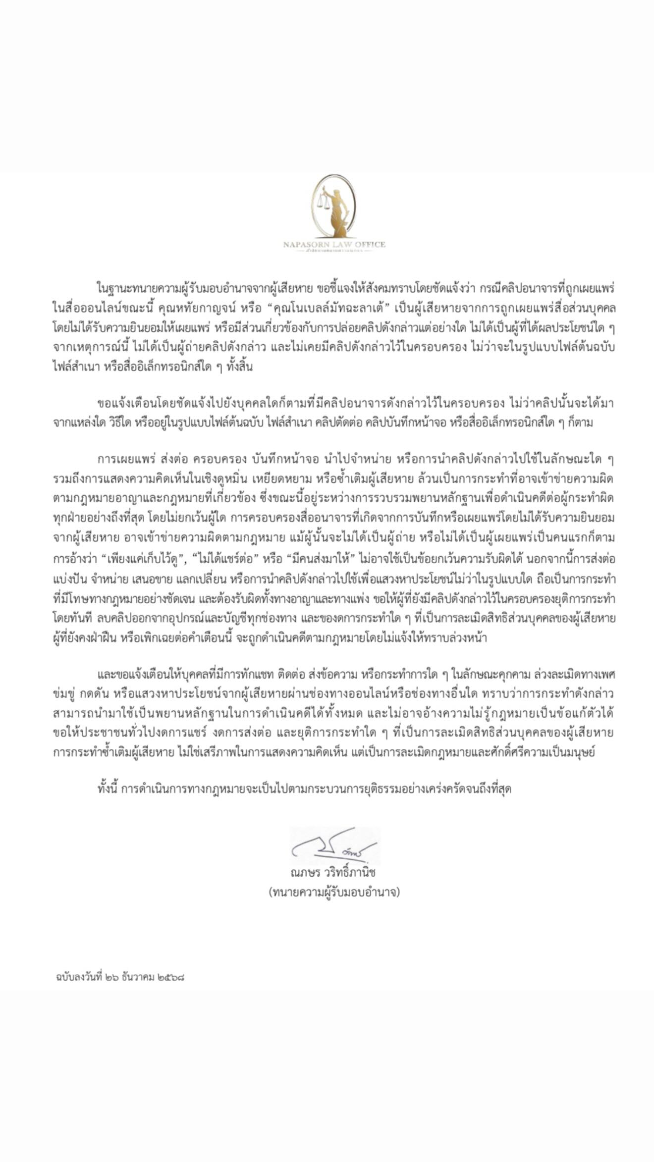 ในเอกสารยังระบุคำเตือนไปยังบุคคลใดก็ตามที่มีคลิปดังกล่าวไว้ในครอบครอง ไม่ว่าจะได้มาด้วยวิธีใด หรือรูปแบบใด (ไฟล์ต้นฉบับ, บันทึกหน้าจอ) การเผยแพร่ ส่งต่อ หรือนำไปจำหน่าย ล้วนเป็นการกระทำที่อาจเข้าข่ายความผิดตามกฎหมายอาญาและกฎหมายที่เกี่ยวข้อง ซึ่งขณะนี้ทางทีมกฎหมาย "อยู่ระหว่างการรวบรวมพยานหลักฐานเพื่อดำเนินคดีต่อผู้กระทำผิดทุกฝ่ายอย่างถึงที่สุด โดยไม่ยกเว้นผู้ใด"