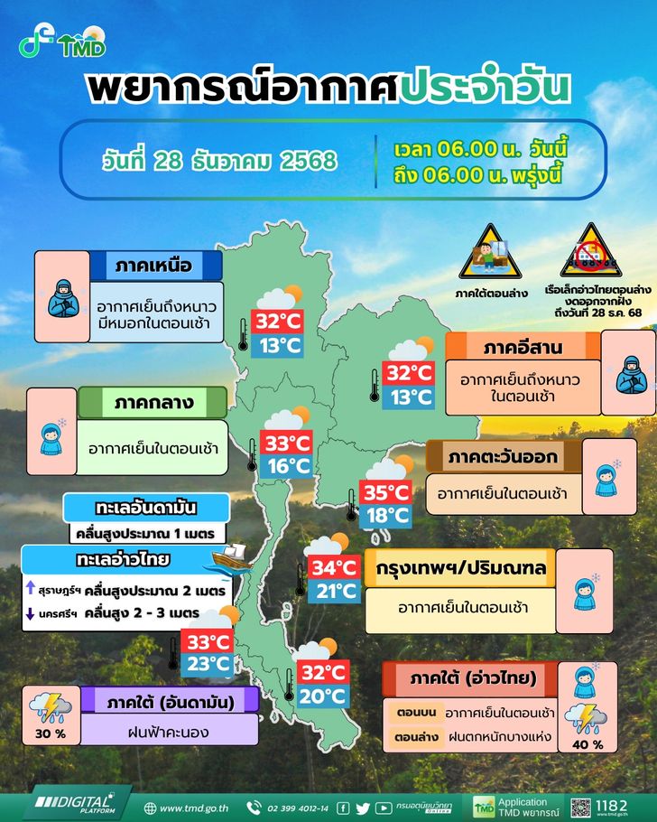 ขอให้ชาวเรือบริเวณอ่าวไทยและทะเลอันดามันเดินเรือด้วยความระมัดระวัง และหลีกเลี่ยงการเดินเรือในบริเวณที่มีฝนฟ้าคะนอง เรือเล็กบริเวณอ่าวไทยตอนล่างควรงดออกจากฝั่งต่อไปอีก 1 วัน (28 ธ.ค. 68) และประชาชนบริเวณชายฝั่งภาคใต้ฝั่งตะวันออกตอนล่างควรระมัดระวังคลื่นที่ซัดเข้าหาฝั่งไว้ด้วย