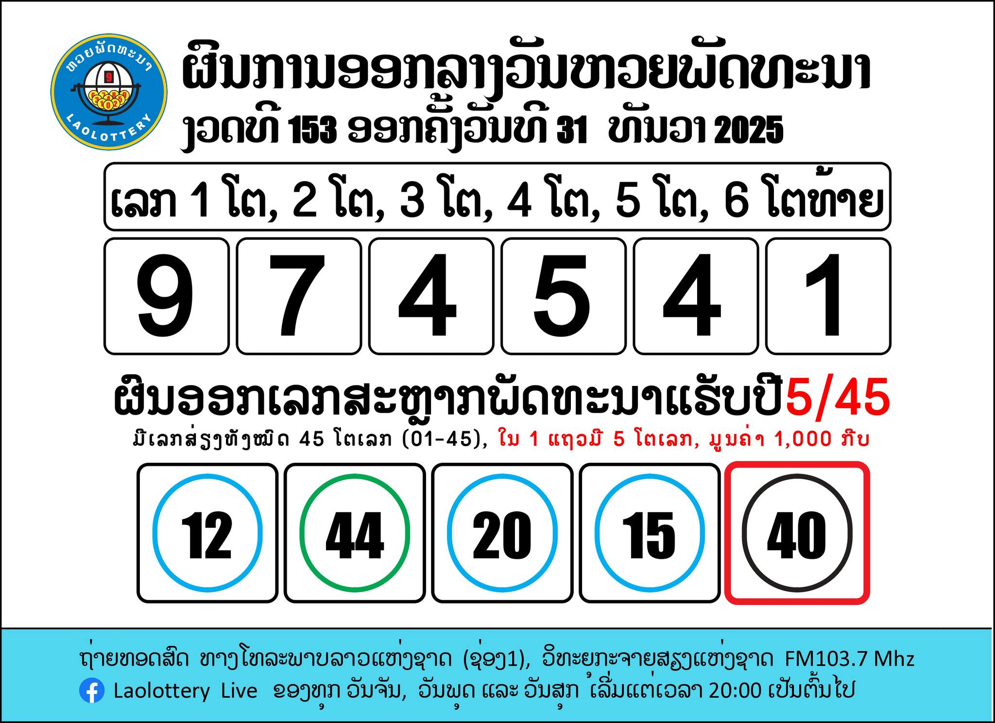 ลุ้นผล หวยลาววันนี้ 31/12/68 ถ่ายทอดสดหวยลาว หวยลาวล่าสุด หวยลาวพัฒนา 31 ธันวาคม 2568 หวยลาวย้อนหลัง หวยลาว 6 ตัว วันนี้ออกอะไร งวด 31 ธันวาคม 2568 Laolottery หวยลาว ออกรางวัลทุก วันจันทร์ วันพุธ และ วันศุกร์