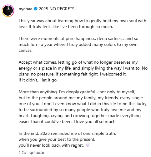 "ณิชา ณัฏฐณิชา" บทสรุปปี 2025 ชีวิตที่ได้เรียนรู้ ไม่มีคำว่าเสียใจ"ณิชา ณัฏฐณิชา" โพสต์สรุปปี 2025 ปีแห่งการรักตัวเองและไม่มีคำว่าเสียใจ