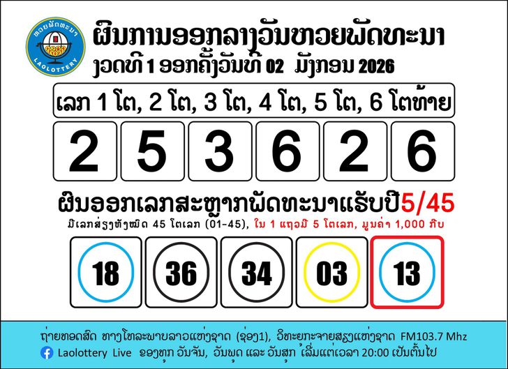รายงานผลหวยลาว 2 มกราคม 2569 (02/01/69) ผลหวยลาว 6 ตัว ออกรางวัลดังนี้