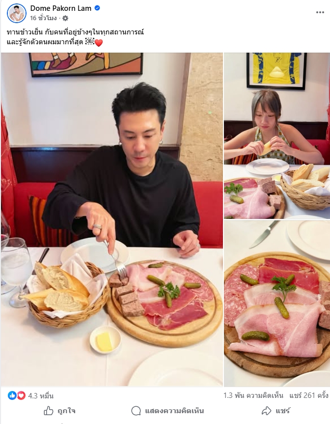 โดยในโพสต์ดังกล่าว หนุ่มโดม ได้ระบุข้อความสั้นๆ แต่ความหมายลึกซึ้งว่า "ทานข้าวเย็น กับคนที่อยู่ข้างๆในทุกสถานการณ์ และรู้จักตัวตนผมมากที่สุด" ซึ่งถือเป็นการยืนยันถึงความรักและความสัมพันธ์ที่เหนียวแน่น แม้ในช่วงที่ต้องเผชิญกับกระแสวิพากษ์วิจารณ์หรือดราม่าต่างๆ ในโลกออนไลน์