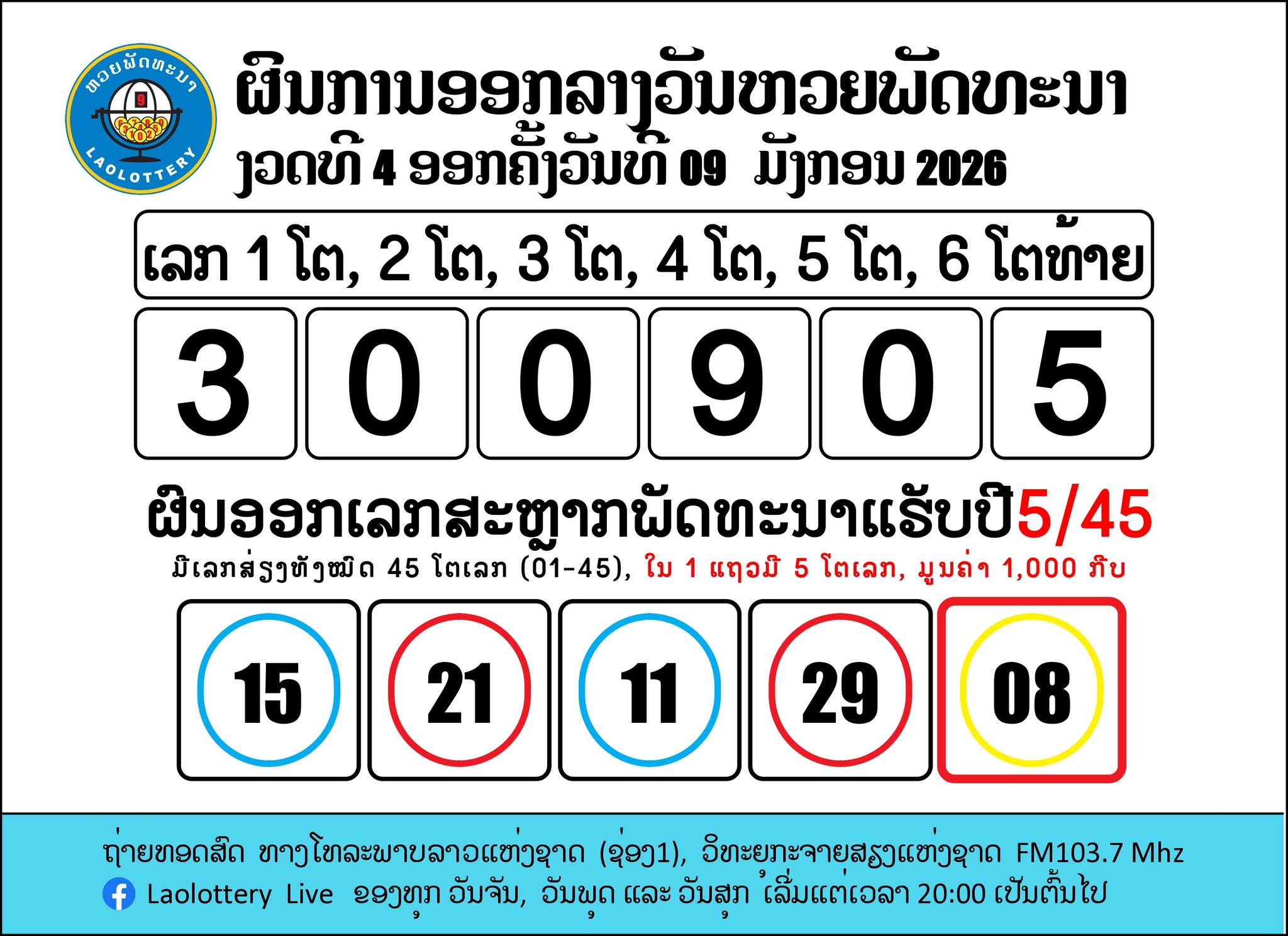 รายงานผลหวยลาว 9 มกราคม 2569 (09/01/69) ผลหวยลาว 6 ตัว ออกรางวัลดังนี้