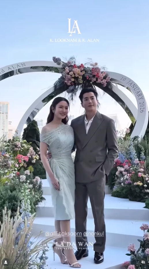 งานนี้ แอฟ ทักษอร ปรากฏตัวในลุคที่สวยสะกดสายตา ด้วยชุดเดรสยาวคลุมเข่าสีเขียวอ่อน ดีไซน์เปิดไหล่เบาๆ เผยผิวขาวเนียนดูเรียบหรูและเลอค่า ยืนเคียงข้าง นนกุล ที่มาในลุคหล่อเนี้ยบกับชุดสูทสีน้ำตาล เป็นภาพคู่ที่ดูลงตัวและเหมาะสมกันราวกับกิ่งทองใบหยกจริงๆ