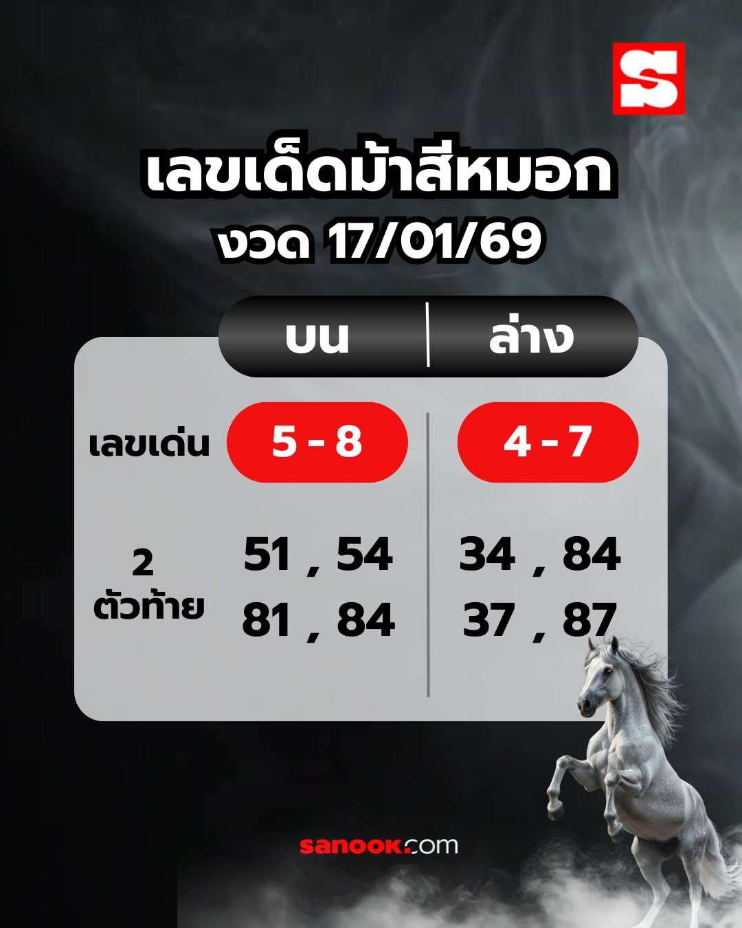 เลขเด็ด ม้าสีหมอก งวดนี้ 17/1/69 อัปเดตแนวทางเลขเด่น-เลขท้าย 2 ตัว