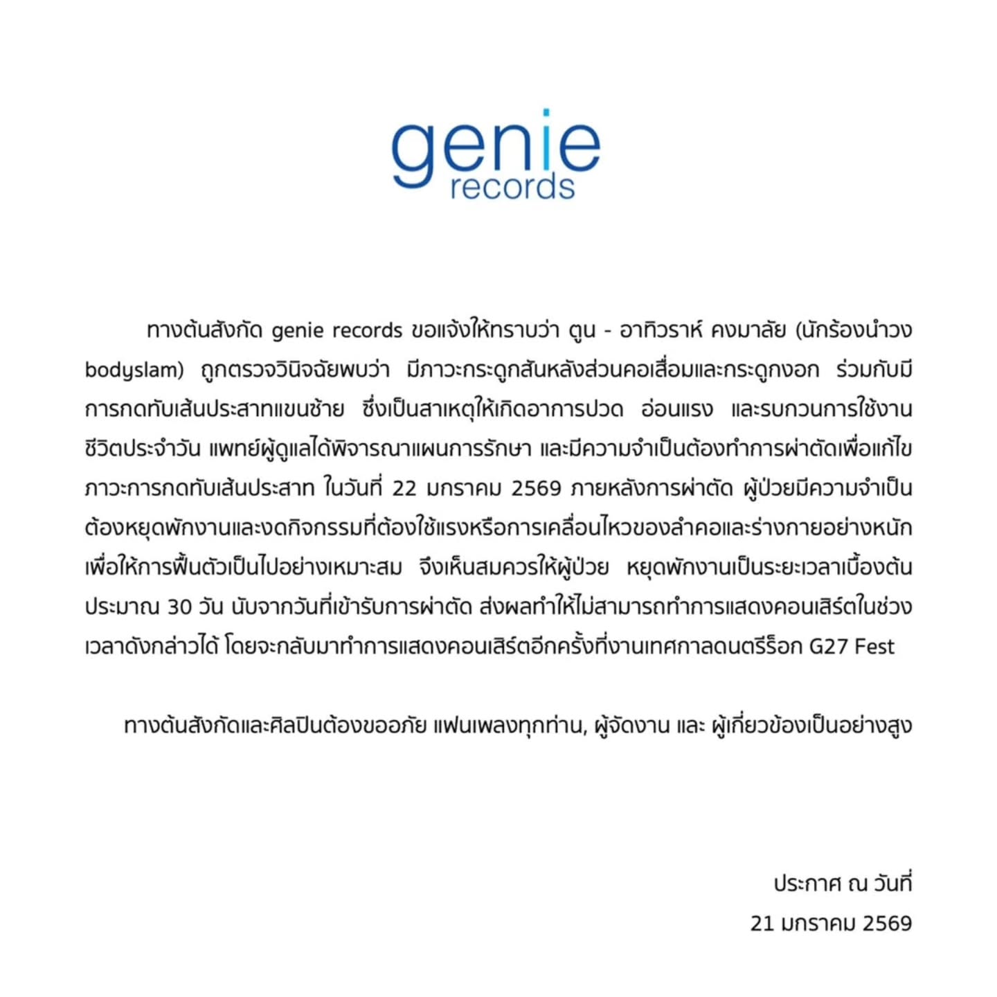 "ตูน บอดี้สแลม" ผ่าตัดกระดูกคอกดทับเส้นประสาท หลังแขนซ้ายอ่อนแรงแฟนคลับแห่ส่งกำลังใจ "ตูน บอดี้สแลม" พักไมค์ด่วน! เข้าผ่าตัดกระดูกคอกดทับเส้นประสาท