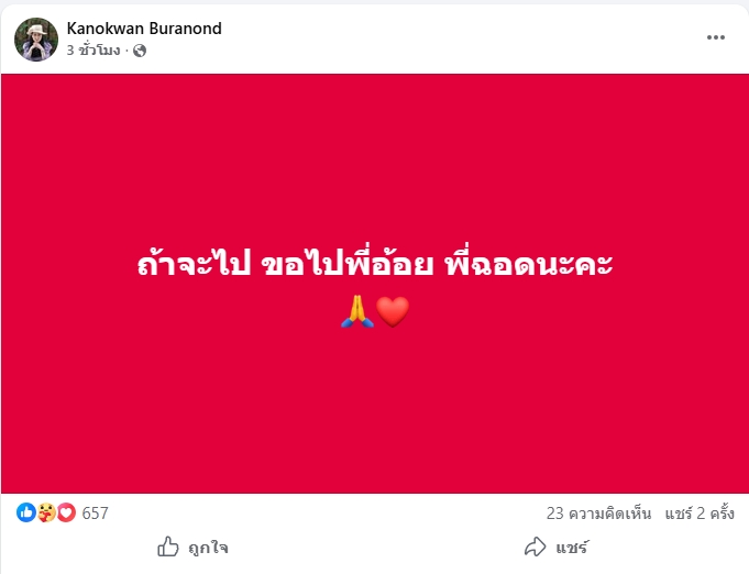 โดย ปู กนกวรรณ ได้โพสต์ข้อความสั้นๆ แต่ความหมายสุดลึกซึ้งว่า "ถ้าจะไป ขอไปพี่อ้อย พี่ฉอดนะคะ" ซึ่งอย่างที่ทุกคนรู้กันดีว่า พี่อ้อย-พี่ฉอด คือพิธีกรตัวแม่จากรายการดังอย่าง Club Friday พื้นที่ถ่ายทอดประสบการณ์ความรักที่เต็มไปด้วยความเจ็บปวดและบทเรียนชีวิต