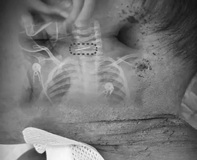 ที่น่าตกใจคือ แพทย์พบเข็มเย็บรองเท้าที่หักเป็น 2 ท่อน ฝังลึกอยู่บริเวณกระดูกสันหลังส่วนคอของเด็ก จำเป็นต้องผ่าตัดฉุกเฉินทันที เนื่องจากตำแหน่งดังกล่าวอยู่ใกล้หลอดเลือดแดงคาโรติด ซึ่งหากเกิดความผิดพลาดเพียงเล็กน้อย อาจทำให้เด็กเสียชีวิตได้