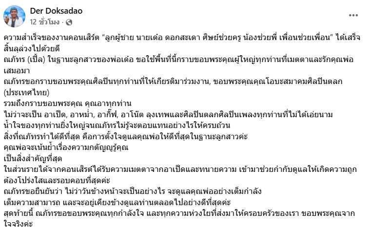 "ความสำเร็จของงานคอนเสิร์ต “ลูกผู้ชาย นายเด๋อ ดอกสะเดา ศิษย์ช่วยครู น้องช่วยพี่ เพื่อนช่วยเพื่อน” ได้เสร็จสิ้นลุล่วงไปด้วยดี ณภัทร (เปิ้ล) ในฐานะลูกสาวของพ่อเด๋อ ขอใช้พื้นที่นี้กราบขอบพระคุณผู้ใหญ่ทุกท่านที่เมตตาและรักคุณพ่อเสมอมา ณภัทรขอกราบขอบพระคุณศิลปินทุกท่านที่ให้เกียรติมาร่วมงาน, ขอบพระคุณคุณโอบะสมาคมศิลปินตลก (ประเทศไทย) รวมถึงกราบขอบพระคุณ คุณอาทุกท่าน ไม่ว่าจะเป็น อาเป็ด, อาหม่ำ, อากิ๊ฟ, อาโน๊ต ลุงเทพและศิลปินตลกศิลปินเพลงทุกท่านที่ไม่ได้เอ่ยนามน้ำใจของทุกท่านยิ่งใหญ่"