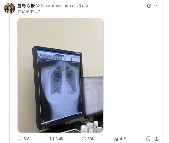 กลายเป็นไวรัลถล่มทลายชั่วข้ามคืน! สำหรับ "โทโยชิมะ โคโคโระ" (Toyoshima Kokoro) นางแบบกราเวียร์ดาวรุ่งของญี่ปุ่น ที่ตั้งใจจะโชว์ผลตรวจสุขภาพยืนยันว่า "ปอดของฉันสะอาดแข็งแรงดี" แต่ภาพฟิล์มเอกซเรย์ที่เธอโพสต์กลับทำเอาโซเชียลแตกตื่น จนยอดวิวพุ่งกระฉูดกว่า 30 ล้านครั้งในวันเดียว