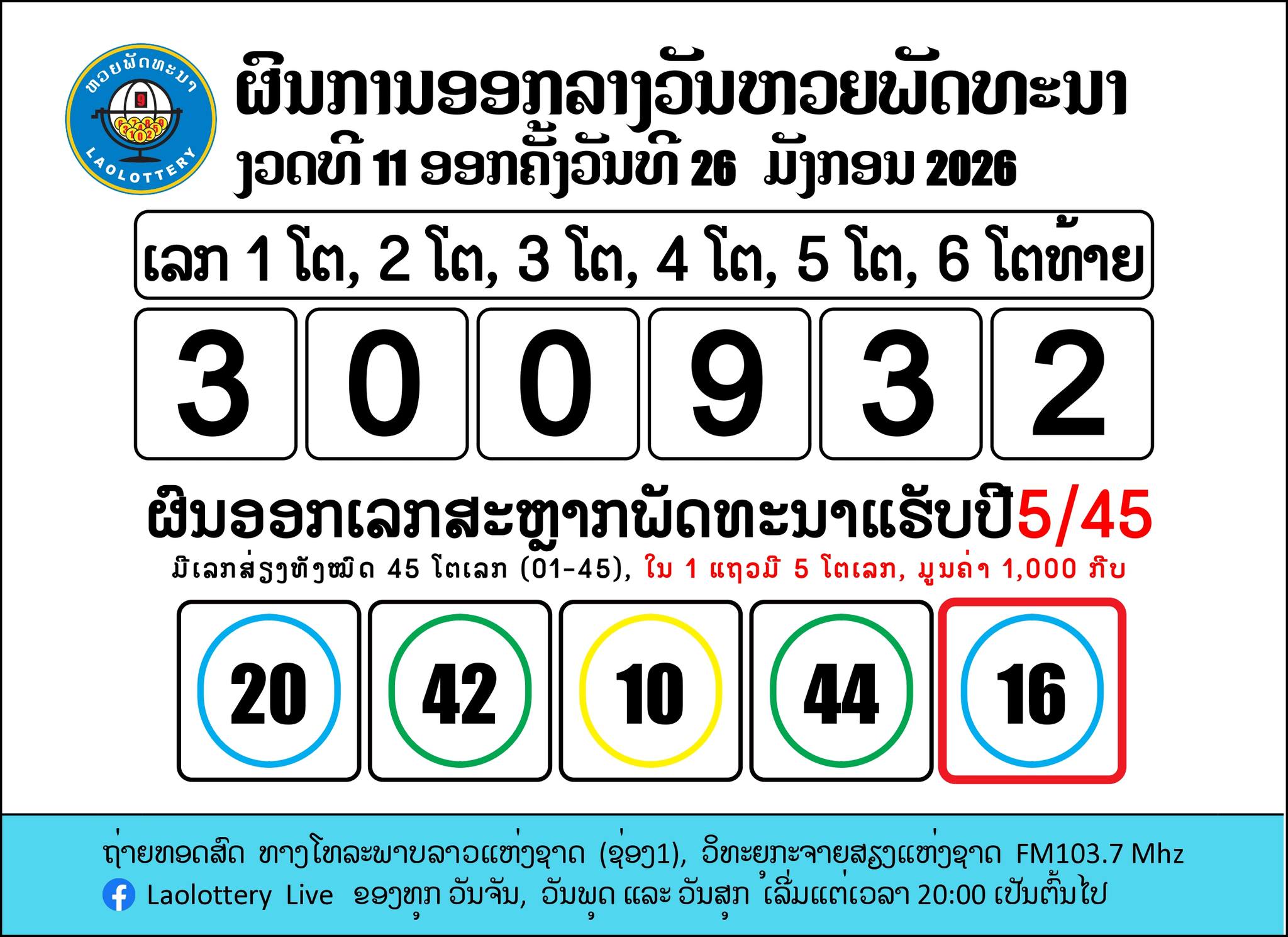 รายงานผลหวยลาว 26 มกราคม 2569 และผลหวยลาว 6 ตัว รวมถึงผลสลากพัฒนา ออกรางวัลดังนี้