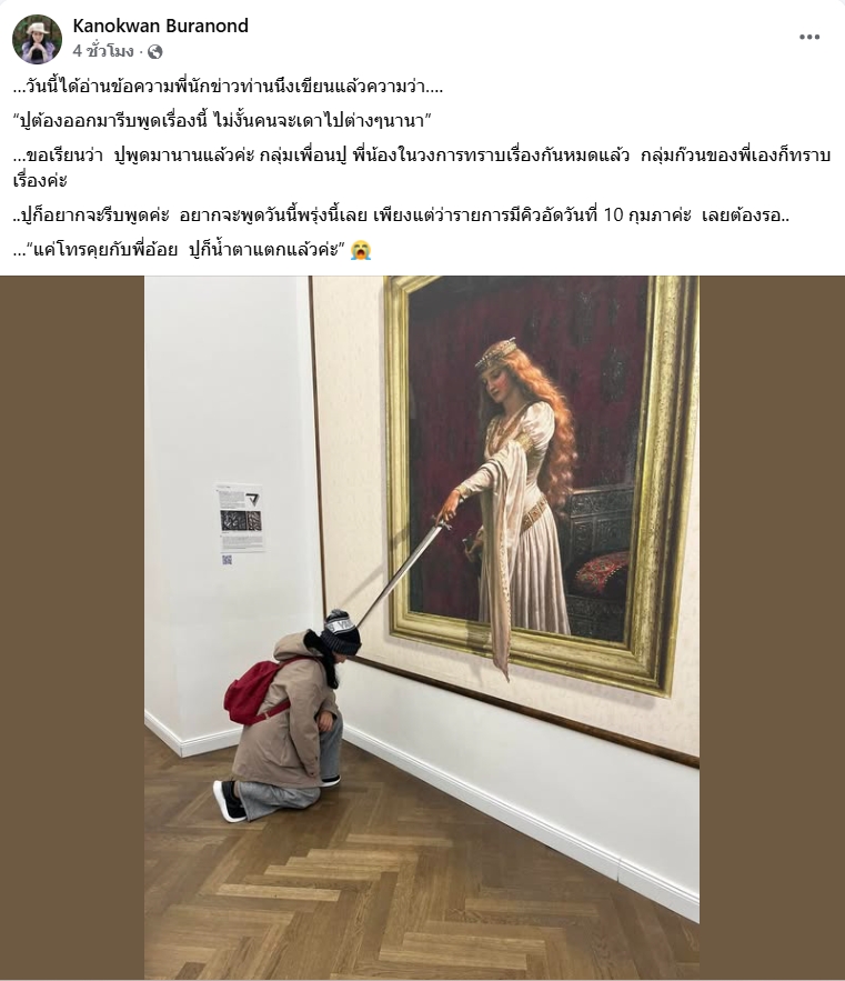 ล่าสุด ปู กนกวรรณ ไม่ปล่อยให้สงสัยนาน ได้ออกมาโพสต์ข้อความชี้แจงความในใจ โดยยืนยันว่าตนเองพร้อมที่จะพูดความจริงทั้งหมด แต่ติดที่เงื่อนไขเรื่องเวลาและคิวงาน โดยระบุว่า: