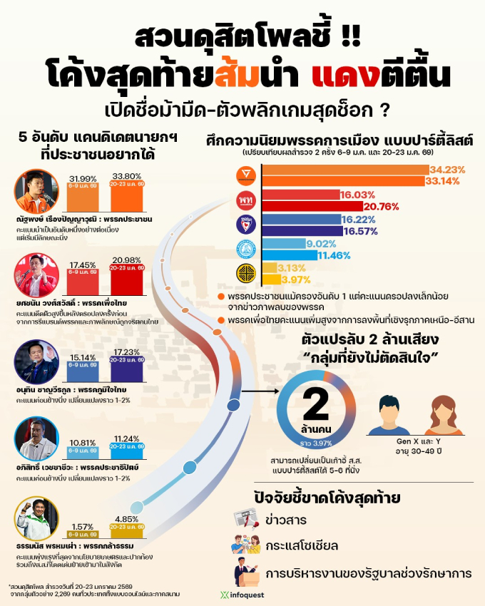 สวนดุสิตโพลชี้ !! โค้งสุดท้ายส้มนำ แดงตีตื้น เปิดชื่อม้ามืด-ตัวพลิกเกมสุดช็อก ?