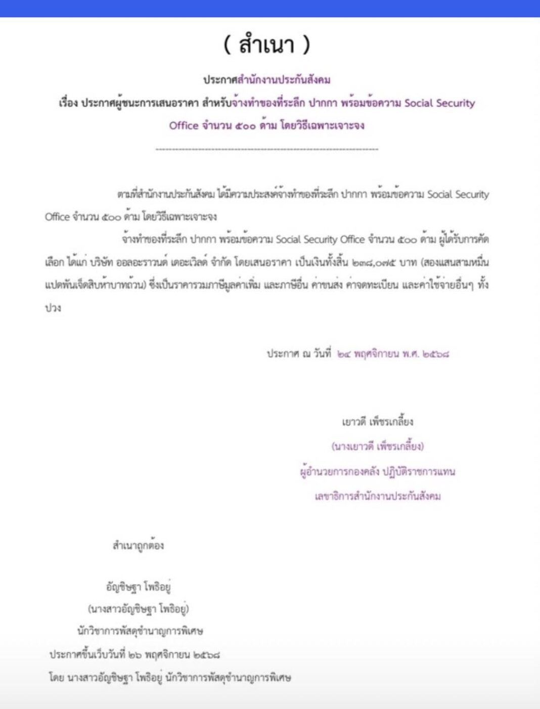 เปิดเอกสาร สปส.จัดซื้อปากกา 500 ด้าม 2.4 แสนบาท ตกด้ามละเกือบ 500 ชาวเน็ตร้องหูยยย จำเป็นหรือ ตั้งคำถามความโปร่งใส?
