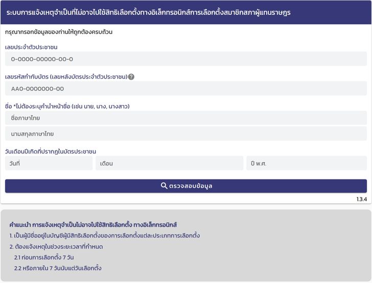 - ค้นหาบริการ "ตรวจสอบสิทธิเลือกตั้ง สส. และแจ้งเหตุไม่ไปใช้สิทธิ"