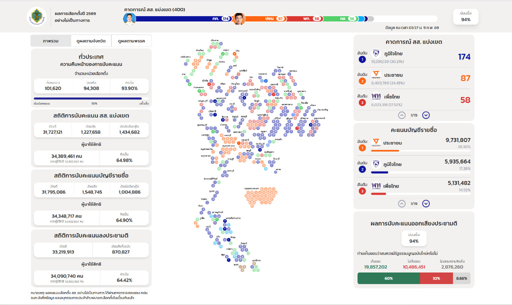ผลเลือกตั้ง 69 (นับ 94%) "ภูมิใจไทย" ผงาดกวาด สส.เขต 174 ที่นั่ง - "พรรคประชาชน" แชมป์ปาร์ตี้ลิสต์ - ประชามติ "เห็นชอบ" ทะลุ 60%