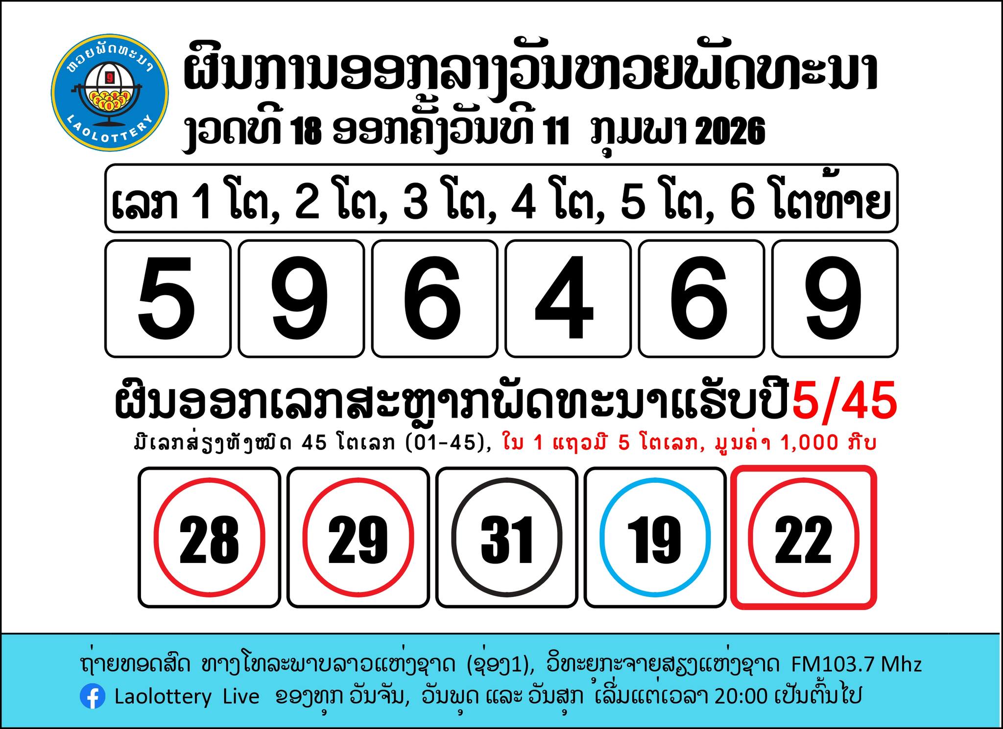 รายงานผลหวยลาว 11 กุมภาพันธ์ 2569 และผลหวยลาว 6 ตัว รวมถึงผลสลากพัฒนา ออกรางวัลดังนี้