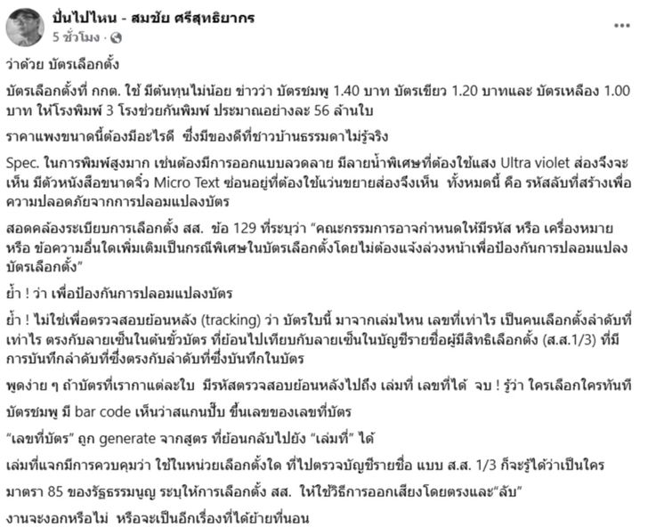 "สมชัย" โพสต์ปมบัตรเลือกตั้ง ชี้สเปกไม่ธรรมดา เตือน กกต.ระวังงานงอกปมบาร์โค้ด