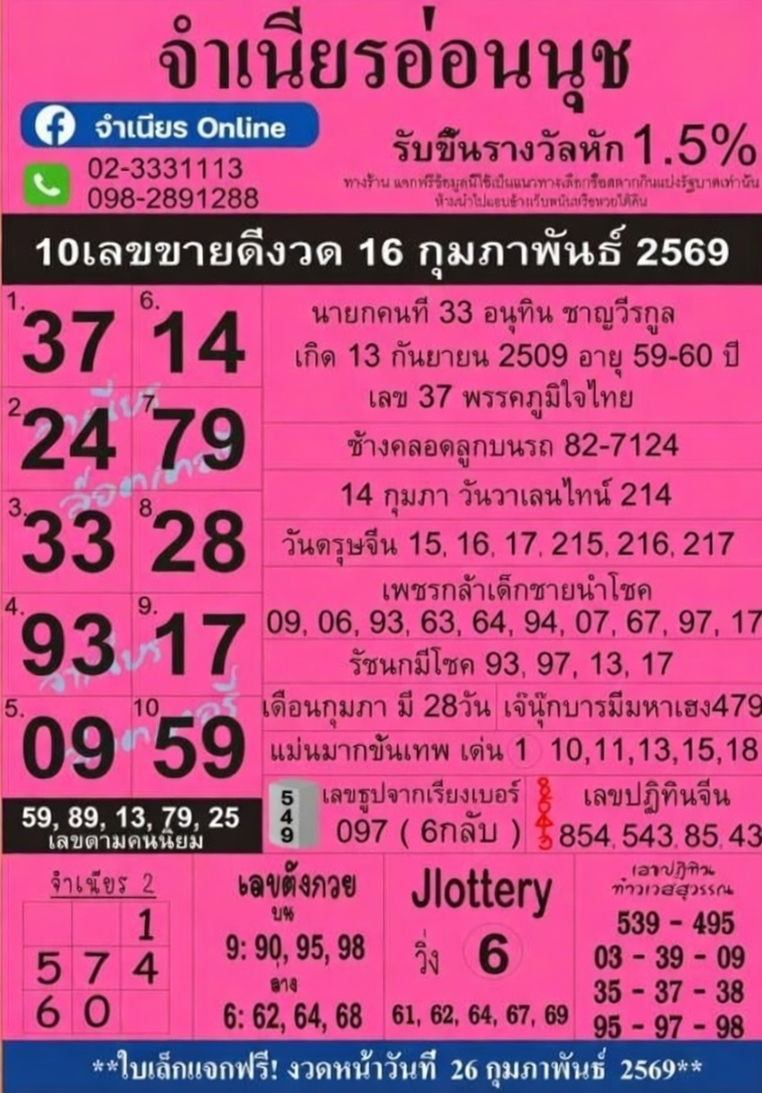 10 อันดับเลขเด็ดขายดี “หวยแม่จำเนียร” ใบชมพู งวด 16/2/69 พร้อมที่มาของเลขดังทุกตัว