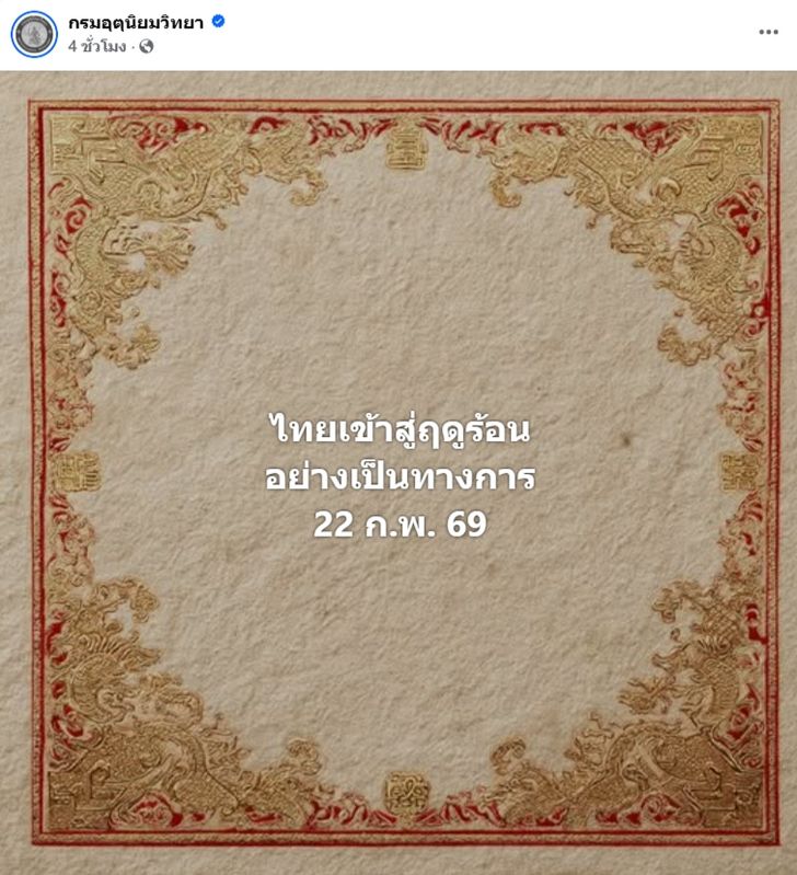 กรมอุตุนิยมวิทยา ออกประกาศอย่างเป็นทางการว่า ประเทศไทยจะก้าวเข้าสู่ ฤดูร้อน 2569 อย่างเต็มตัวตั้งแต่วันที่ 22 กุมภาพันธ์นี้เป็นต้นไป โดยในปีนี้มีแนวโน้มว่าสภาพอากาศจะร้อนจัดกว่าปีที่ผ่านมา พร้อมเตือนประชาชนให้ระวังพายุฤดูร้อนในช่วงต้นฤดูที่อาจเกิดการเปลี่ยนแปลงของสภาพอากาศอย่างฉับพลัน