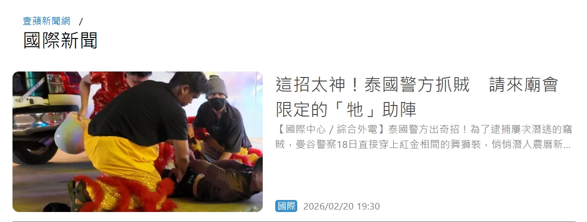 สื่อต่างประเทศ (Next Apple) รายงานว่า เมื่อวันที่ 18 ก.พ. ที่ผ่านมา เจ้าหน้าที่ตำรวจกรุงเทพฯ ได้สร้างตำนานบทใหม่ในการจับกุมคนร้าย ด้วยการสวมชุด "เชิดสิงโต" สีแดงทองสุดอลังการ แฝงตัวเข้าไปในขบวนแห่กลางงานเทศกาลตรุษจีน ณ วัดแห่งหนึ่งในจังหวัดนนทบุรี ก่อนจะอาศัยจังหวะทีเผลอ พุ่งออกจากหัวสิงโตเข้าตะครุบตัวผู้ต้องหาจนมุมคาลานวัด ท่ามกลางสายตาชาวบ้านที่มาเที่ยวงาน