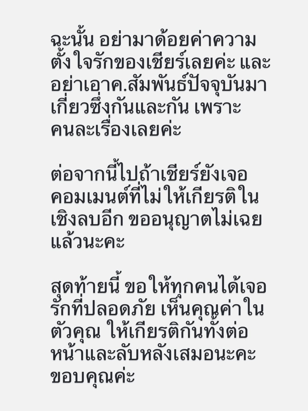 "ฉะนั้น อย่ามาด้อยค่าความตั้งใจรักของเชียร์เลยค่ะ และอย่าเอาความสัมพันธ์ปัจจุบันมาเกี่ยวซึ่งกันและกัน เพราะคนละเรืองเลยค่ะ ต่อจากนี้ไปถ้าเชียร์ยังเจอ คอมเมนต์ที่ไม่ให้เกียรติในเชิงลบอีก ขออนุญาตไม่เฉยแล้วนะคะ"