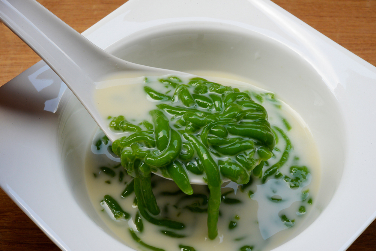 8. ลอดช่องน้ำกะทิ - 3.4 คะแนน: เส้นลอดช่องสีเขียวหอมกลิ่นใบเตย ทานคู่กับน้ำกะทิเคี่ยวกับน้ำตาลปึก ในอดีตเป็นขนมที่นิยมใช้ในงานแต่งงานเพื่อสื่อถึงความรักที่ยืนยาวตามลักษณะเส้นที่ยืนยาว