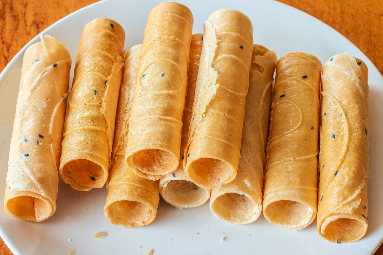 10. ทองม้วน - 3.3 คะแนน: ขนมขบเคี้ยวไทยที่มีรูปร่างเหมือนซิการ์ ทำจากแป้งข้าวเจ้าและกะทิ มีความกรอบและหอมมัน เป็นของฝากยอดนิยมจากโครงการ OTOP ที่หาทานได้ง่ายและถูกใจคนทุกวัย
