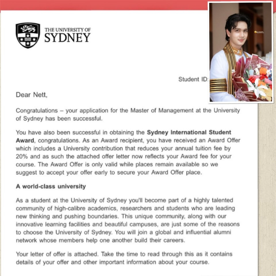 "เน็ต" ลูกชาย "กวาง-น็อต" บินเรียนต่อป.โทแล้ว เผยจดหมายตอบรับจากสถาบันระดับโลก"เน็ต เขมะโยธิน" เหินฟ้าต่อ ป.โท ซิดนีย์ "แม่กวาง-พ่อน็อต" กอดส่งสุดอบอุ่น หล่อ เก่ง ครบสูตรจริงๆ