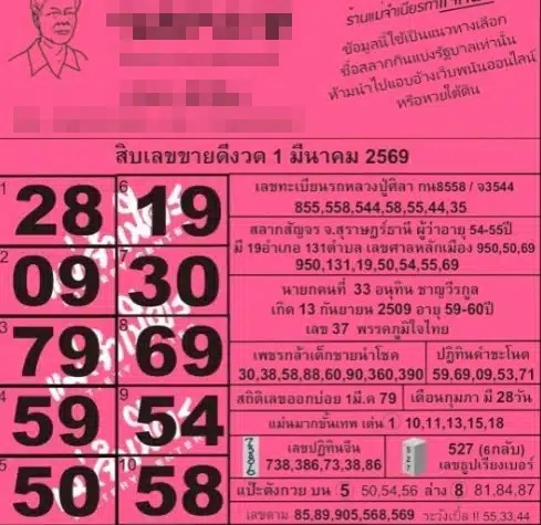 หวยแม่จำเนียร 1/3/69 เปิด 10 อันดับเลขขายดี “ใบชมพู” งวดสลากสัญจรสุราษฎร์ธานี