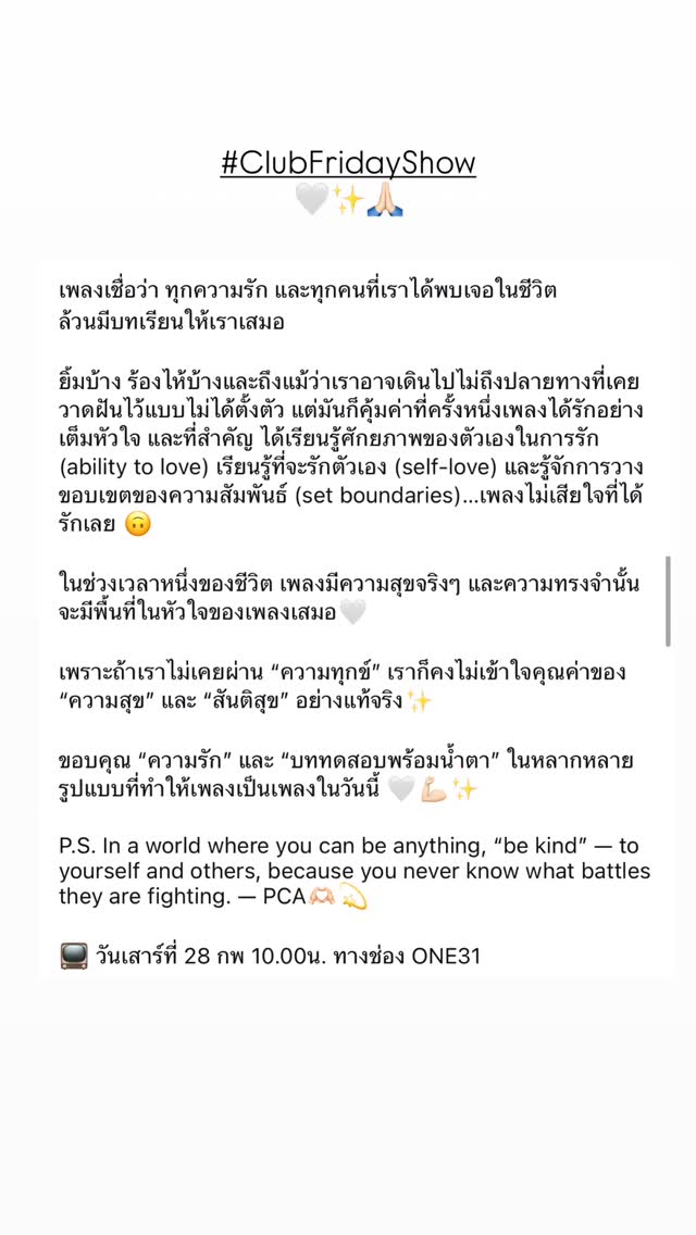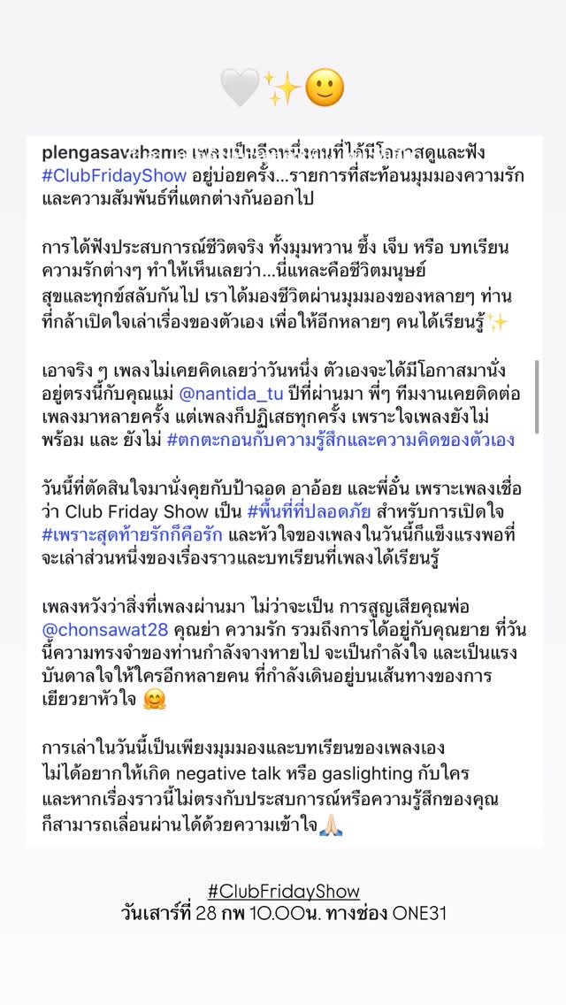 "วันนี้ที่ตัดสินใจมานั่งคุยกับป้าฉอด อาอ้อย และพี่อั๋น เพราะเพลงเชื่อว่า Club Friday Show เป็น #พื้นที่ที่ปลอดภัย สำหรับการเปิดใจ #เพราะสุดท้ายรักก็คือรัก และหัวใจของเพลงในวันนี้ก็แข็งแรงพอที่จะเล่าส่วนหนึ่งของเรื่องราวและบทเรียนที่เพลงได้เรียนรู้เพลงหวังว่าสิ่งที่เพลงผ่านมา ไม่ว่าจะเป็น การสูญเสียคุณพ่อ @chonsawat28 คุณย่า ความรัก รวมถึงการได้อยู่กับคุณยาย ที่วันนี้ความทรงจำของท่านกำลังจางหายไป จะเป็นกำลังใจ และเป็นแรงบันดาลใจให้ใครอีกหลายคน ที่กำลังเดินอยู่บนเส้นทางของการเยียวยาหัวใจการเล่าในวันนี้เป็นเพียงมุมมองและบทเรียนของเพลงเองไม่ได้อยากให้เกิด negative talk หรือ gaslighting กับใครและหากเรื่องราวนี้ไม่ตรงกับประสบการณ์หรือความรู้สึกของคุณก็สามารถเลื่อนผ่านได้ด้วยความเข้าใจ"