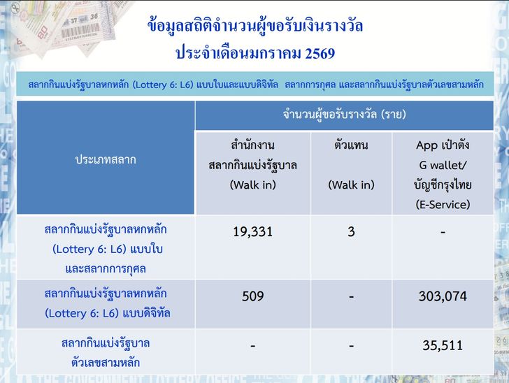 สถิติจำนวนผู้ขอรับรางวัลสลากกินแบ่งรัฐบาล ย้อนหลัง 1 ปี (มกราคม 2568 - มกราคม 2569)