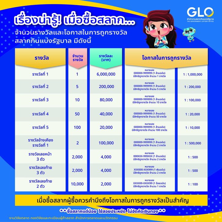 โดยข้อมูลจากสำนักงานสลากกินแบ่งรัฐบาล ระบุว่าในสลาก 1 ชุด หรือ 1 ล้านฉบับ จะมีรางวัลรวมทั้งสิ้น 14,168 รางวัล เมื่อพิจารณาจากสลากจำนวน 1 ล้านใบ โอกาสที่จะถูกรางวัลแต่ละประเภทถูกแบ่งสัดส่วนไว้ดังนี้