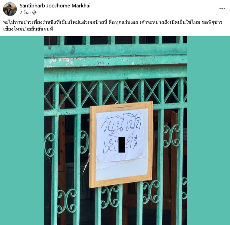ผู้ใช้เฟซบุ๊กชื่อ Santibharb JooJhome Markhai ได้โพสต์ภาพป้ายดังกล่าว พร้อมข้อความว่า ขณะกำลังจะไปกินข้าวกลางวันที่ร้านแห่งหนึ่งในเชียงใหม่ กลับเห็นป้ายหน้าร้านที่อ่านแล้วทำให้รู้สึกสะดุ้งทุกครั้งที่มอง จึงตั้งคำถามว่าเจ้าของร้านต้องการสื่อว่า “เปิดตอนเย็น” ใช่หรือไม่