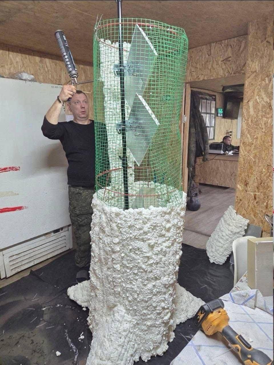 การสร้างผิวสัมผัส: ใช้ โฟมฉีดก่อสร้าง (Construction Foam) พ่นทับเพื่อให้เกิดความแข็งแรงและมีพื้นผิวขรุขระเลียนแบบเปลือกไม้จริง