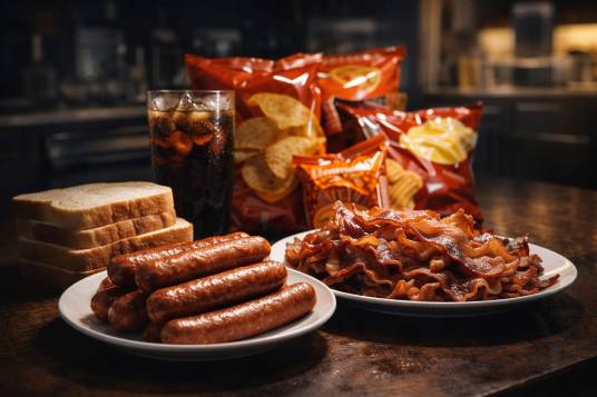 เนื้อสัตว์แปรรูป เช่น ไส้กรอก แฮม เบคอน หรือเนื้อรมควัน มักมีทั้งโซเดียมสูง ไขมันอิ่มตัว และสารกันเสีย งานวิจัยจำนวนมากเชื่อมโยงอาหารกลุ่มนี้กับความเสี่ยงโรคหัวใจและมะเร็งบางชนิด