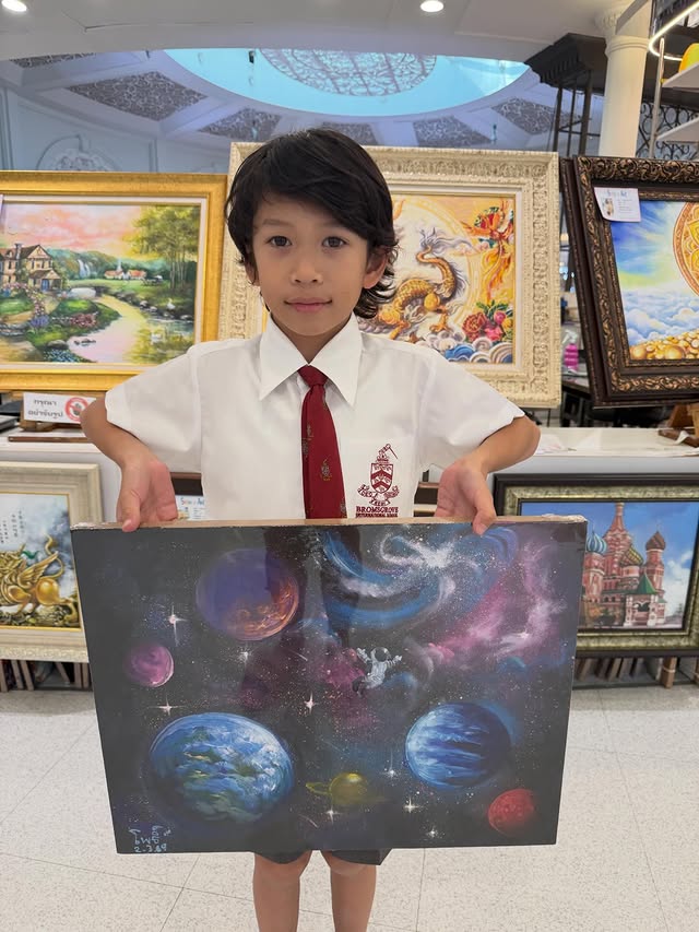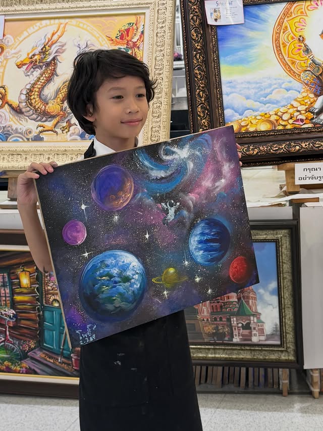 “พี่โพธิ์ตั้งใจวาดภาพ กาแลคซี่ภาพนี้เพื่อมอบให้กับการร่วมประมูลช่วยเหลือเด็ก ในงานยูนิเซฟ บลูสตาร์ กาล่า 2026 ( UNICEF Blue Star Gala2026) รายได้จากการระดมทุนในครั้งนี้จะถูกนำไปขับเคลื่อนภารกิจด้านโภชนาการเด็กทั้งในประเทศไทยและในพื้นที่วิกฤตทั่วโลก ภาพวาดที่พี่เค้าตั้งใจวาดในครั้งนี้ มีผู้ชนะการประมูล ด้วยมูลค่า 120,000 ( หนึ่งแสนสองหมื่นบาท ) ต้องขอขอบคุณ ผู้เข้าร่วมประมูลภาพของน้องด้วยค่ะ บอกให้ลูกฟังลูกดีใจมาก ๆ และต้องขอขอบคุณ ครูผู้ฝึกสอนที่คอยไกด์ และประมวลความคิด ความชอบของน้องจนออกมาเป็นภาพนี้ ช่วงนี้โพธิ์ ชอบในเรื่องของกาแลคซี่ดวงดาว และแผนที่โลกมากๆ เค้าจึงเลือกที่จะวาดภาพนี้ ทุกอย่างเกิดจากความชอบและความตั้งใจมาก ๆ ถ้าลองสังเกตในภาพจะมีภาพเค้าลอยอยู่บนกาแลคซี่ด้วยค่ะ ขอบคุณลูกนะครับที่รู้จักการมีน้ำใจแบ่งปันให้กับเพื่อนมนุษย์"