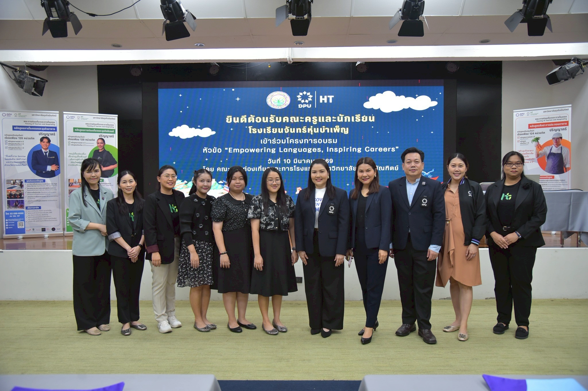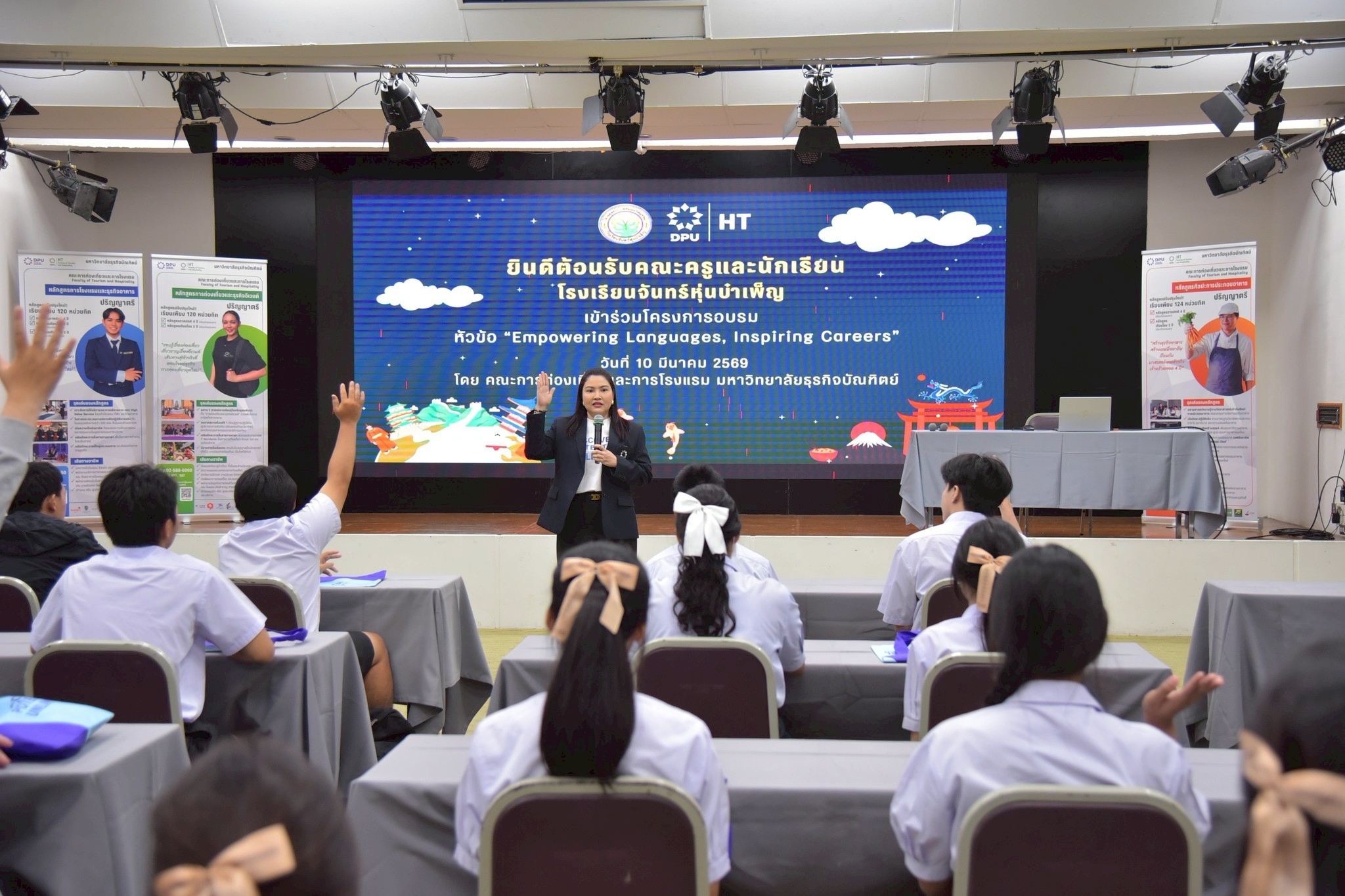 คณะการท่องเที่ยวและการโรงแรม มหาวิทยาลัยธุรกิจบัณฑิตย์ (DPU) จัดกิจกรรมอบรมเชิงวิชาการเพื่อพัฒนาทักษะวิชาชีพ ภายใต้หัวข้อ “Empowering Languages, Inspiring Careers” ให้แก่นักเรียนระดับชั้นมัธยมศึกษาปีที่ 6 สายศิลป์ภาษา จากโรงเรียนจันทร์หุ่นบำเพ็ญ จำนวน 54 คน พร้อมคณะครู เมื่อวันที่ 10 มีนาคม 2569 ณ มหาวิทยาลัยธุรกิจบัณฑิตย์ โดยมีเป้าหมายเพื่อเปิดมุมมองให้นักเรียนเห็นว่า ทักษะทางภาษาเป็นกุญแจสำคัญในการต่อยอดสู่เส้นทางอาชีพในอุตสาหกรรมการท่องเที่ยว การจัดงานอีเวนต์ และธุรกิจบริการระดับสากล