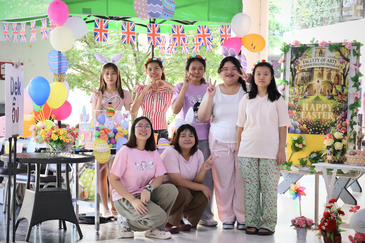 เช่นเดียวกับ นางสาวเสาวลักษณ์ แซ่โจว และ นางสาวณัฐชา เอี่ยมท้วม นักศึกษาชั้นปีที่ 2 หลักสูตรภาษาอังกฤษธุรกิจ คณะศิลปศาสตร์ เปิดเผยว่า กลุ่มของตนได้ออกแบบกิจกรรมภายใต้ธีม “อีสเตอร์” โดยจัดทำป้ายเล่าเรื่องราวของเทศกาลอีสเตอร์บริเวณหน้าบูท เพื่อให้ผู้เข้าร่วมเข้าใจบริบทก่อนร่วมกิจกรรม ภายในบูทมีกิจกรรมหลากหลาย อาทิ การสุ่มหยิบไข่เพื่อทำกิจกรรม การระบายสีในโซนพักผ่อน และเกมส่งต่อไข่โดยใช้ช้อนเดินวนรอบเก้าอี้ โดยกระบวนการทำงานเริ่มจากอาจารย์ให้แนวทางและตัวอย่าง ก่อนที่นักศึกษาจะร่วมกันพัฒนาไอเดีย วางแผน และแบ่งหน้าที่กันอย่างชัดเจน ทั้งการตกแต่งพื้นที่ เป่าลูกโป่ง และเตรียมอุปกรณ์ต่างๆ