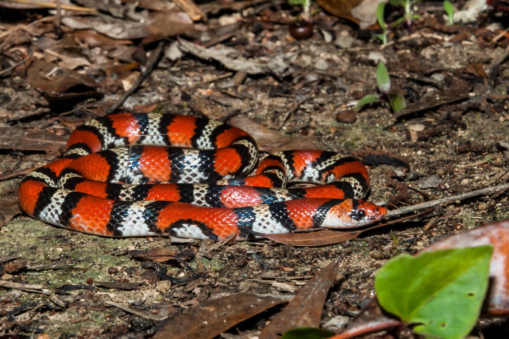 งูสายพันธุ์นี้มีลวดลายแถบสีส้มแดงสลับกับสีดำและขาวอย่างสวยงาม อาศัยอยู่ในป่าฝนเขตร้อน สีสันที่ฉูดฉาดช่วยให้พวกมันพรางตัวเข้ากับกองใบไม้แห้งได้ดีเยี่ยม และเป็นงูที่มีประโยชน์ในการช่วยควบคุมประชากรสัตว์ฟันแทะในธรรมชาติ