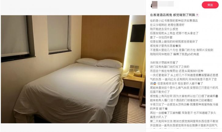 สำนักข่าวฮ่องกง 01 (HK01) รายงานว่า หญิงสาวรายนี้ได้ตั้งชื่อกระทู้ว่า "เจอดีเข้าแล้วที่โรงแรมในฮ่องกง รู้สึกเหมือนมีพลังงานบางอย่าง" โดยเธอเลือกพักที่โรงแรมย่านจิมซาจุ่ยตามคำแนะนำในโซเชียลเนื่องจากราคาประหยัดและทำเลดี แต่กลับต้องเจอประสบการณ์ที่เธอเผยว่า "น่ากลัวเกินไป" และไม่เคยเจอมาก่อนแม้จะเคยพักในโรงแรมที่เก่ากว่านี้ก็ตาม