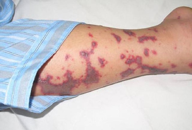 - มีผื่นจ้ำเลือด สีคล้ำ ลักษณะคล้ายดาวกระจาย