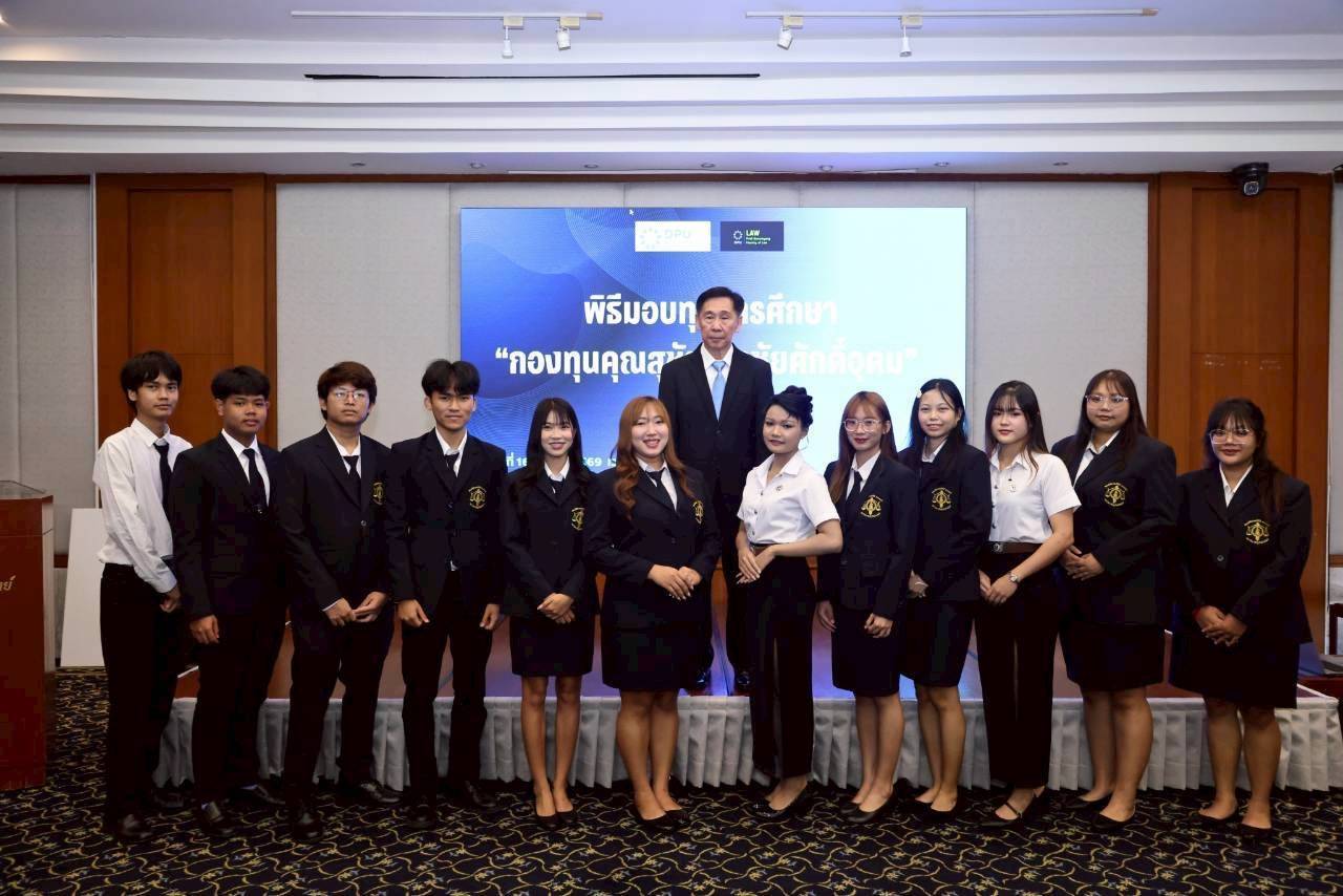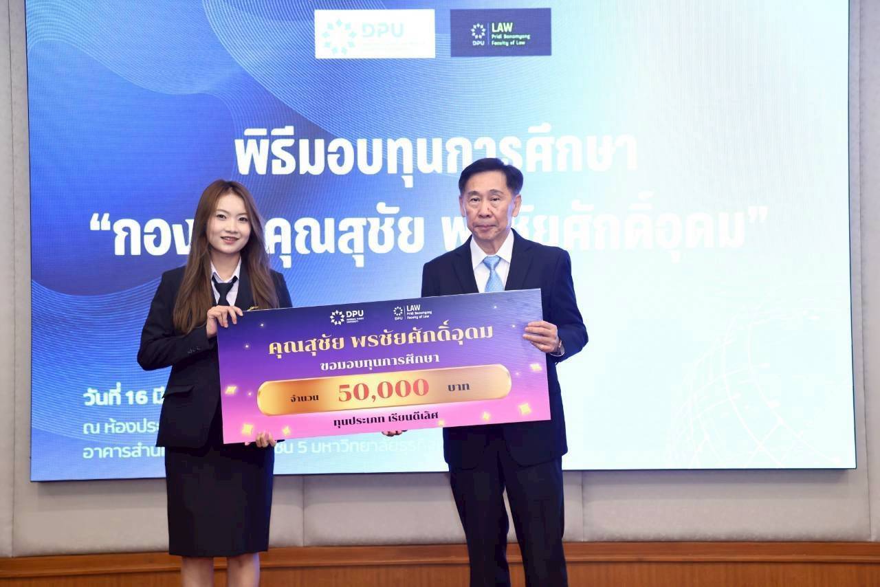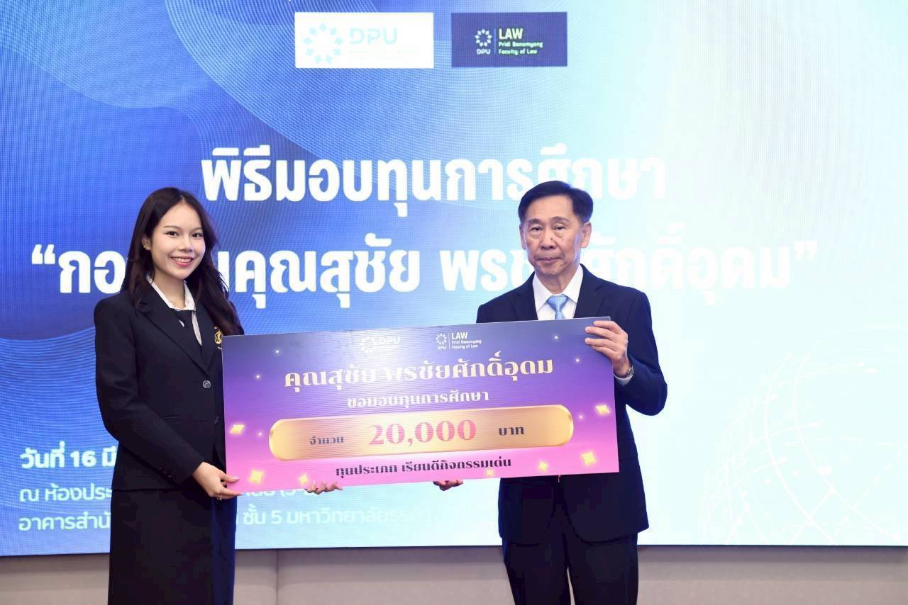 ประธานนักศึกษาหลักสูตร Super LBA รุ่นที่ 2 มอบทุน “กองทุนคุณสุชัย พรชัยศักดิ์อุดม” หนุนโอกาสการศึกษาของนักศึกษาคณะนิติศาสตร์ฯ DPU เสริม “ศักยภาพ” นักกฎหมายรุ่นใหม่สู่สังคมคุณธรรม