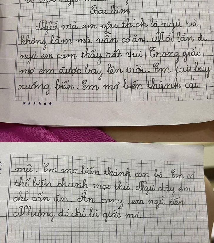 ประโยคเปิดของเรียงความชิ้นนี้ทำเอาคนอ่านสะดุดตาตั้งแต่บรรทัดแรก โดยน้องระบุว่าอาชีพที่ใฝ่ฝันคือ "การนอนและไม่ทำอะไรเลยแต่ยังมีกิน" พร้อมอธิบายเหตุผลประกอบที่เปี่ยมไปด้วยจินตนาการว่า: