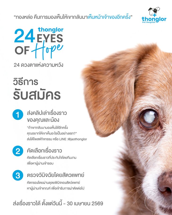 รพ.สัตว์ทองหล่อ เปิดตัวแคมเปญ “24 EYES OF HOPE” มอบแสงสว่างรักษาสัตว์ป่วยต้อกระจก คืนโมเมนต์ "การได้กลับมาเห็นหน้าเจ้าของอีกครั้ง"