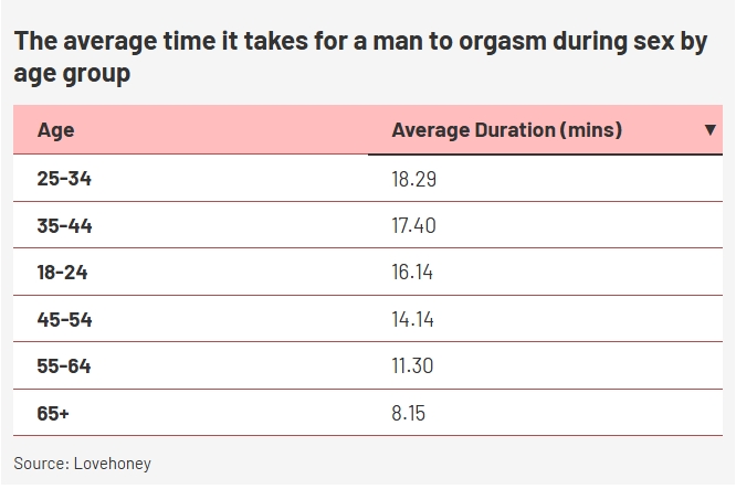 ข้อมูลจากงานวิจัยปี 2025 ของ Lovehoney ชี้ว่า ระยะเวลาจะเพิ่มขึ้นจนถึงช่วงปลายวัย 20–ต้น 30 ก่อนจะค่อยๆ ลดลงตามอายุ