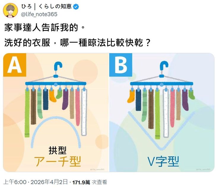 เข้าสู่ช่วงหน้าฝน หลายคนคงเจอปัญหาซักผ้าแล้วไม่แห้ง แถมมีกลิ่นอับ เพจดังจากไต้หวัน "魚漿夫婦" ได้แชร์เทคนิคเด็ดจากผู้เชี่ยวชาญด้านงานบ้านชาวญี่ปุ่น เกี่ยวกับการตากถุงเท้าและเสื้อผ้าชิ้นเล็กให้แห้งเร็วขึ้น เพียงแค่เปลี่ยน "ลำดับการแขวน" และ "ตำแหน่งที่หนีบ" ก็ช่วยได้เยอะครับ