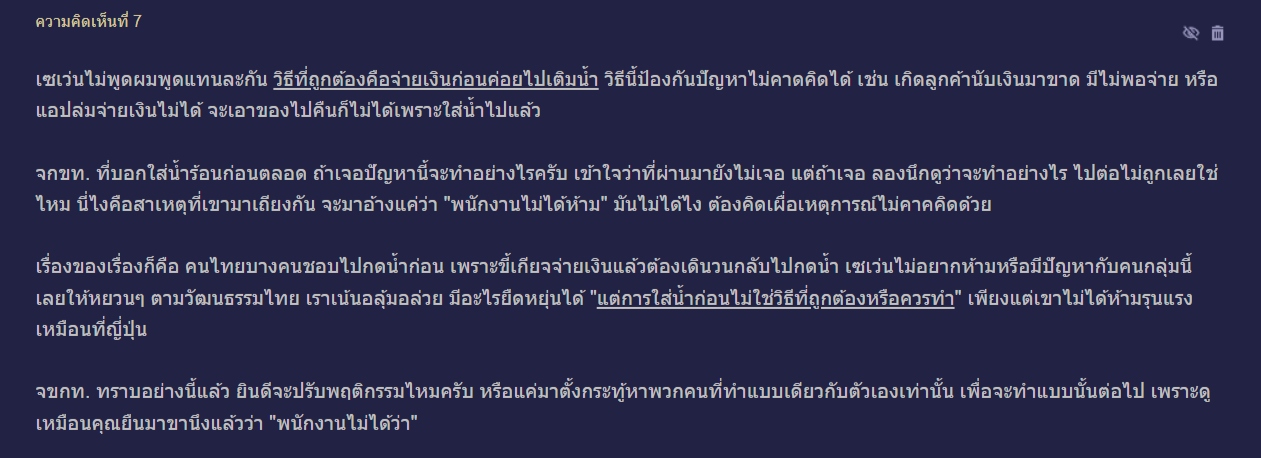 ดังนั้นเพื่อความเป็นระเบียบเรียบร้อย ความปลอดภัยต่อคนรอบข้าง และเพื่อป้องกันปัญหาการชำระเงินผิดพลาดที่อาจเกิดขึ้น แนวทางที่เหมาะสมและถูกต้องที่สุดคือ การนำสินค้าไปชำระเงินที่เคาน์เตอร์ให้เรียบร้อย แล้วจึงค่อยเดินกลับมาใช้บริการจุดน้ำร้อน เพื่อให้เป็นไปตามมาตรฐานการใช้บริการร้านสะดวกซื้อที่ถูกต้อง