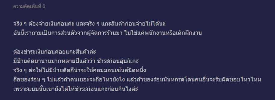ข้อมูลเพิ่มเติมจากผู้ที่เคยสอบถามผู้จัดการร้าน 7-Eleven ระบุว่าตามหลักการบริหารจัดการร้าน "ไม่สามารถแกะสินค้าก่อนจ่ายเงินได้" และในหลายสาขาเคยมีการติดป้ายประกาศ "ชำระก่อนอุ่น/แกะ" มานานแล้ว แต่ที่พนักงานไม่ได้ห้ามปรามรุนแรงในบางครั้ง เป็นเพราะไม่อยากมีปัญหากับลูกค้าและเป็นการผ่อนปรนตามลักษณะนิสัยของคนไทย